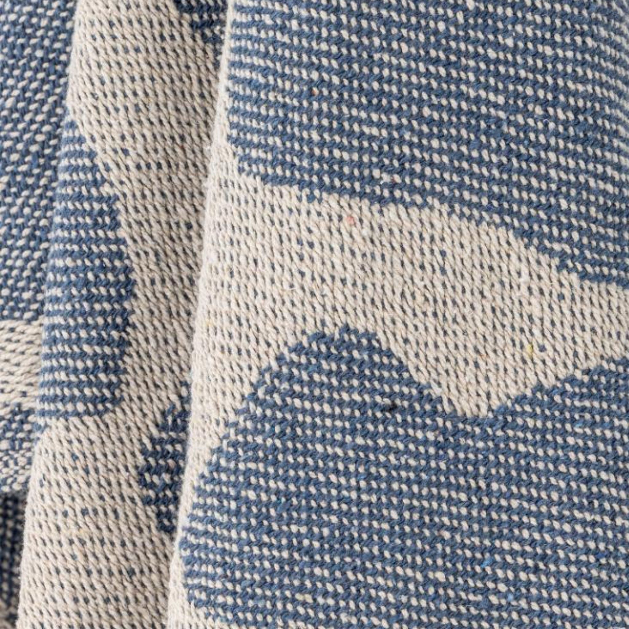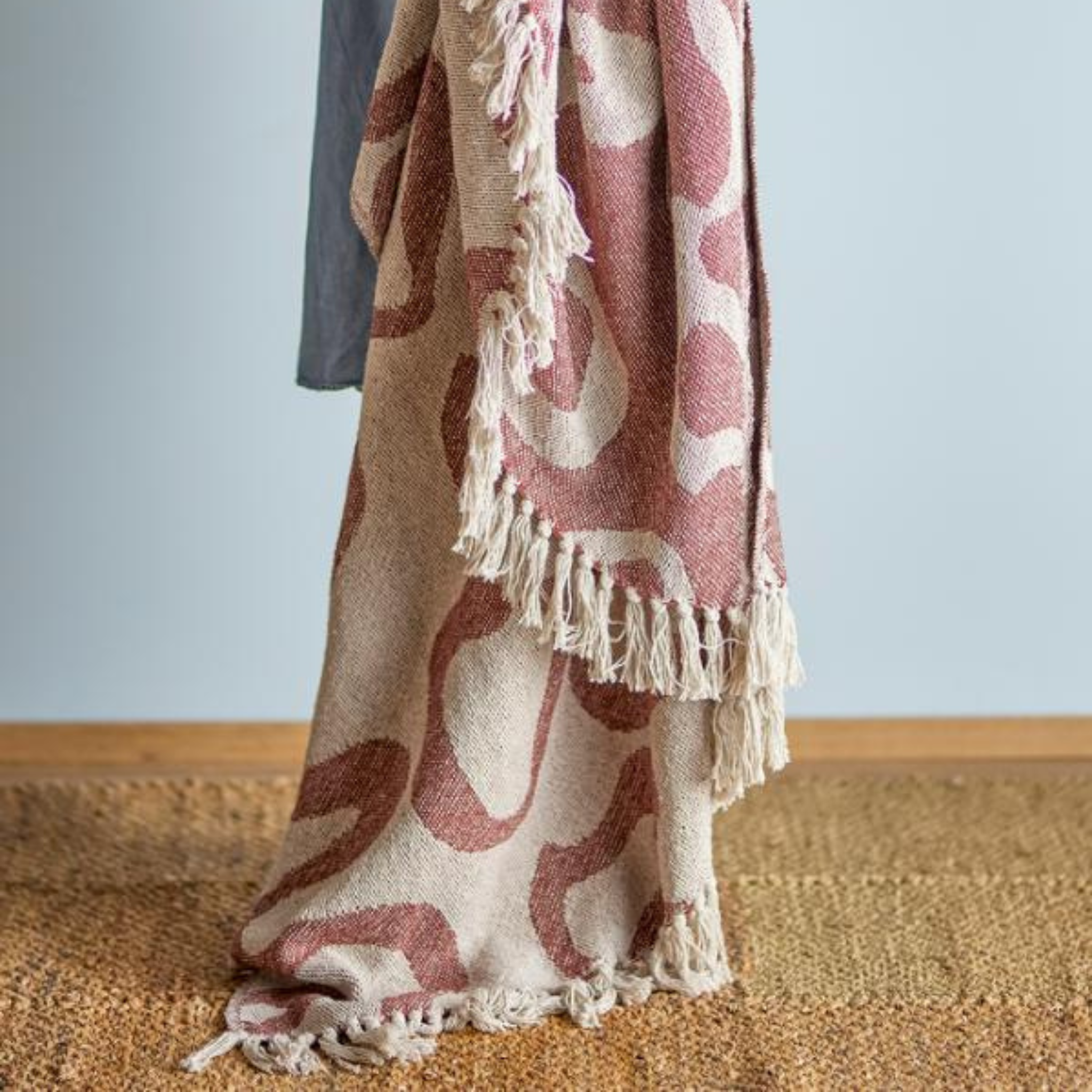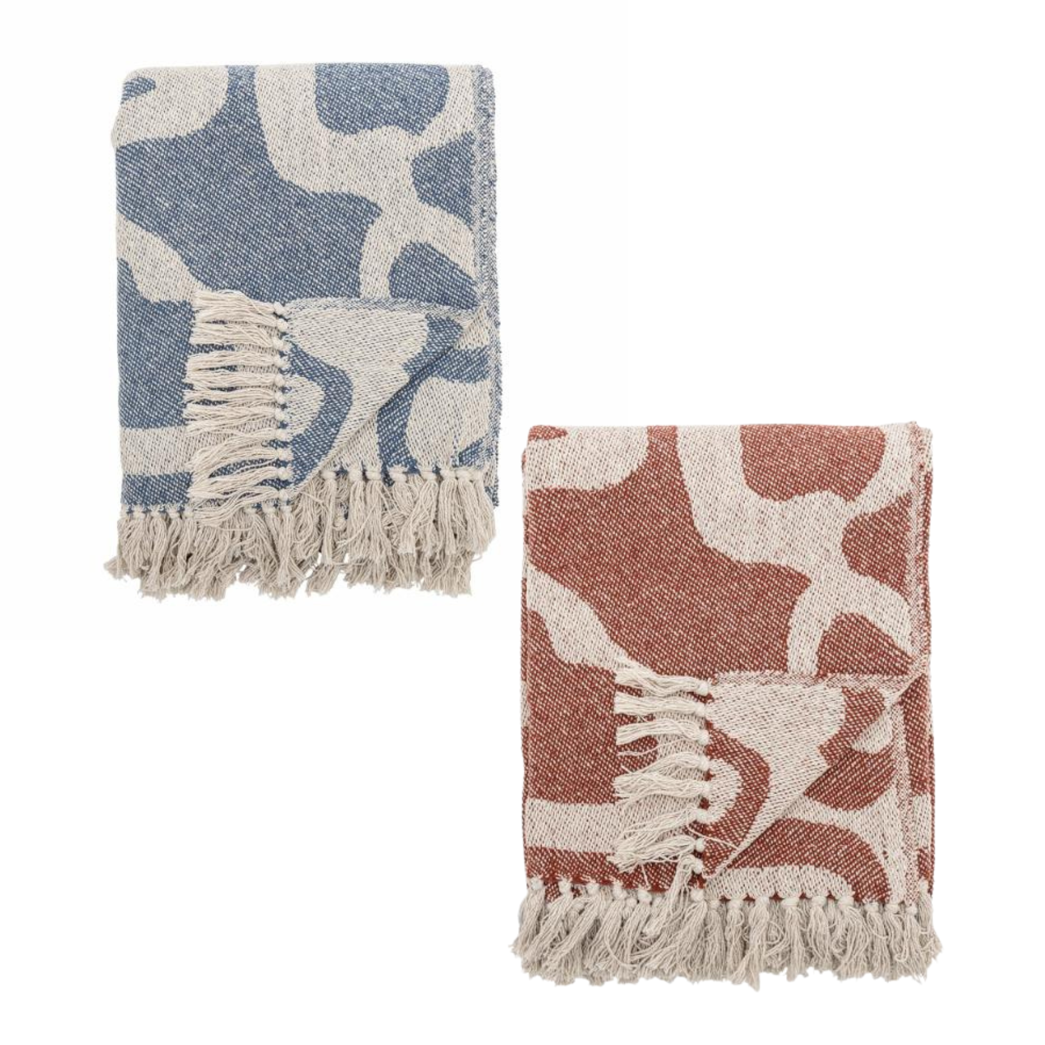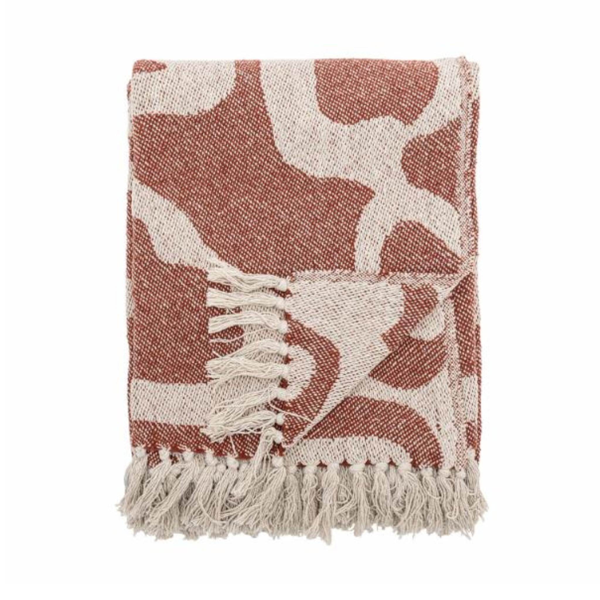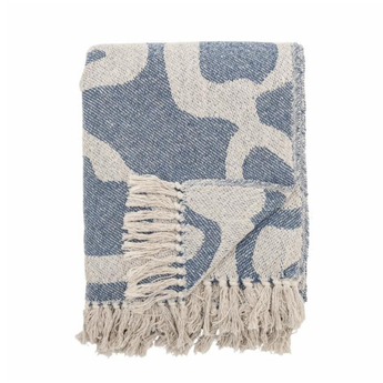 Plaiden er vævet af genanvendt bomuld og har et kunstnerisk mønster i rustrøde og beige eller blå og beige nuancer.