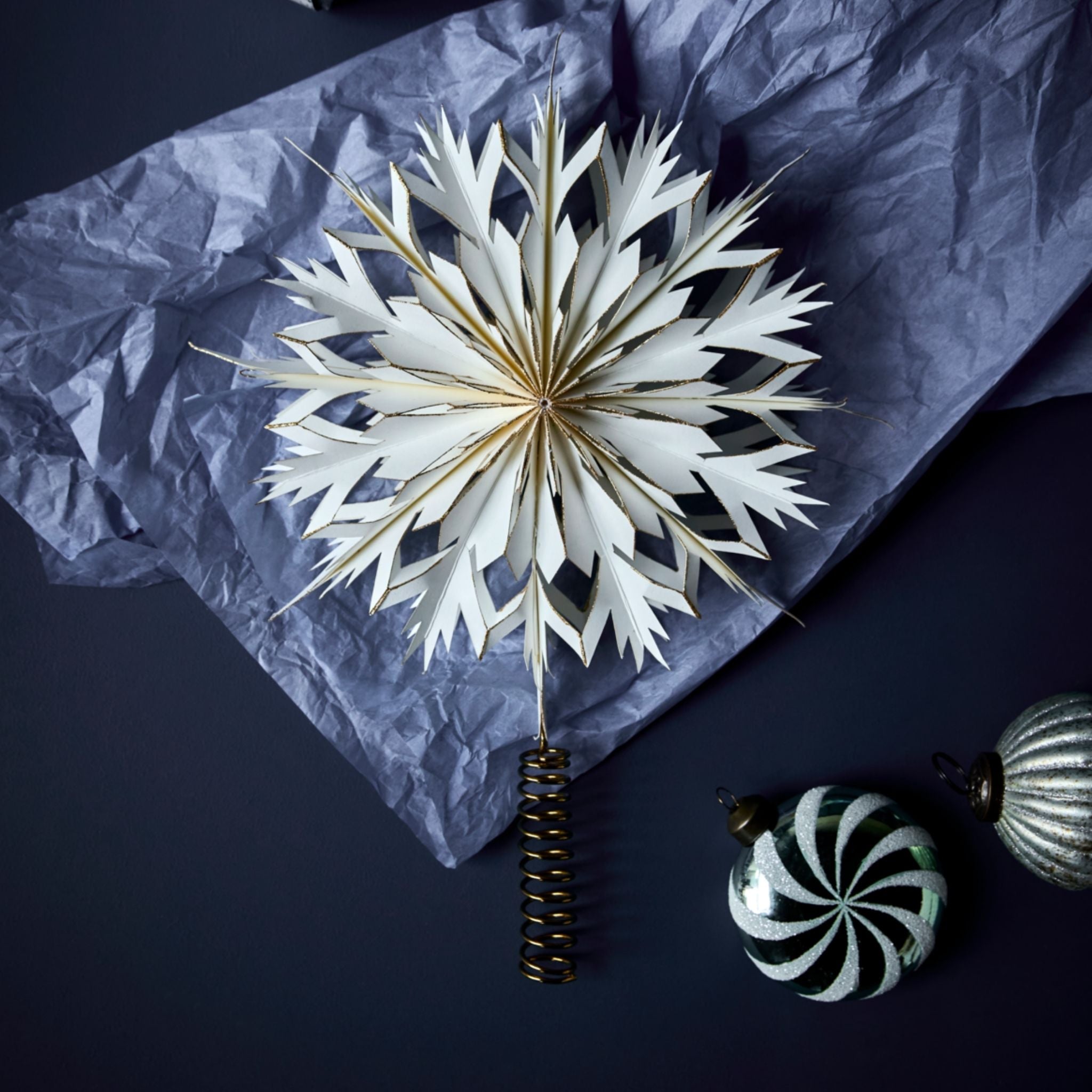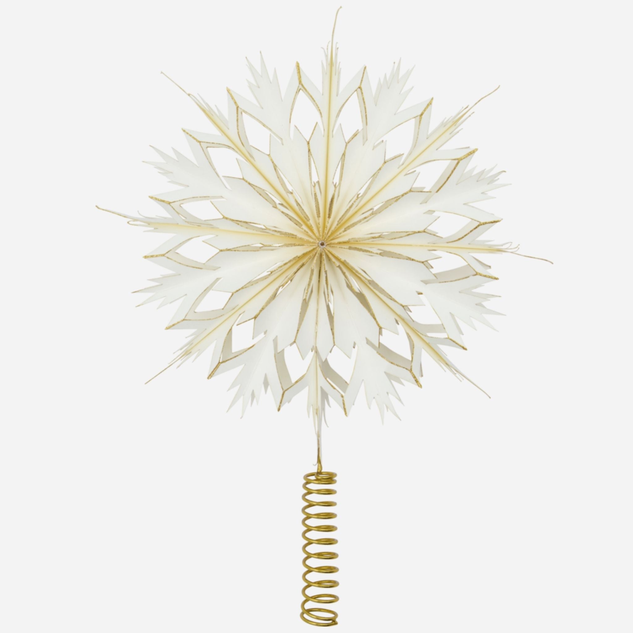 Tilføj et strejf af elegance til dit juletræ med denne smukt håndlavede topstjerne. Fremstillet af hvidt papir med fine udskæringer og diskret guldglimmer bringer den en unik og sofistikeret glans til din juleudsmykning. Den gyldne spiral i jern sikrer både stabilitet og et stilfuldt finish, hvilket gør denne topstjerne til et uundværligt element i din julekollektion